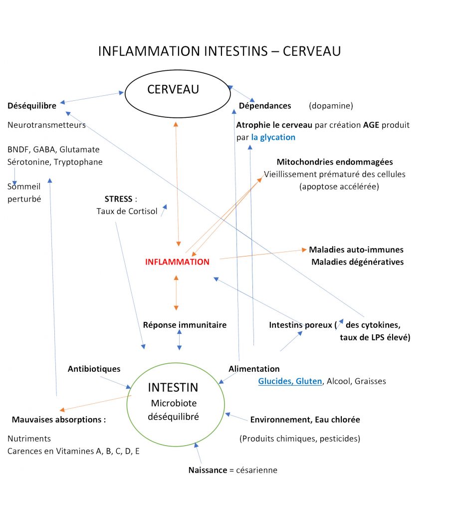 Les glucides (les différents sucres, le gluten, les produits laitiers), les lipides (les différentes graisses), le sommeil, et du stress, ont une influence sur notre poids mais encore plus sur nos maladies car ils créent l’inflammation en détériorant la paroi intestinale. L’inflammation est d’abord chronique avant de s’installer et être entretenue par ces aliments. Mais surtout, elle se généralise jusqu’au cerveau à cause des interactions entre le cerveau et les intestins.